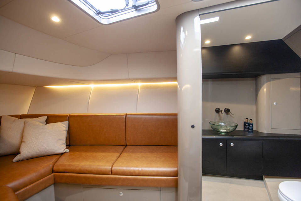 Benedendeks heeft de Venegy V37 eveneens veel te bieden. Het voorschip biedt stahoogte en beschikt over een riante rondzit die eenvoudig te transformeren is naar een tweepersoons bed. Aan stuurboord, onder de stuurstand, bevindt zich een natte cel met elektrisch toilet en douche.